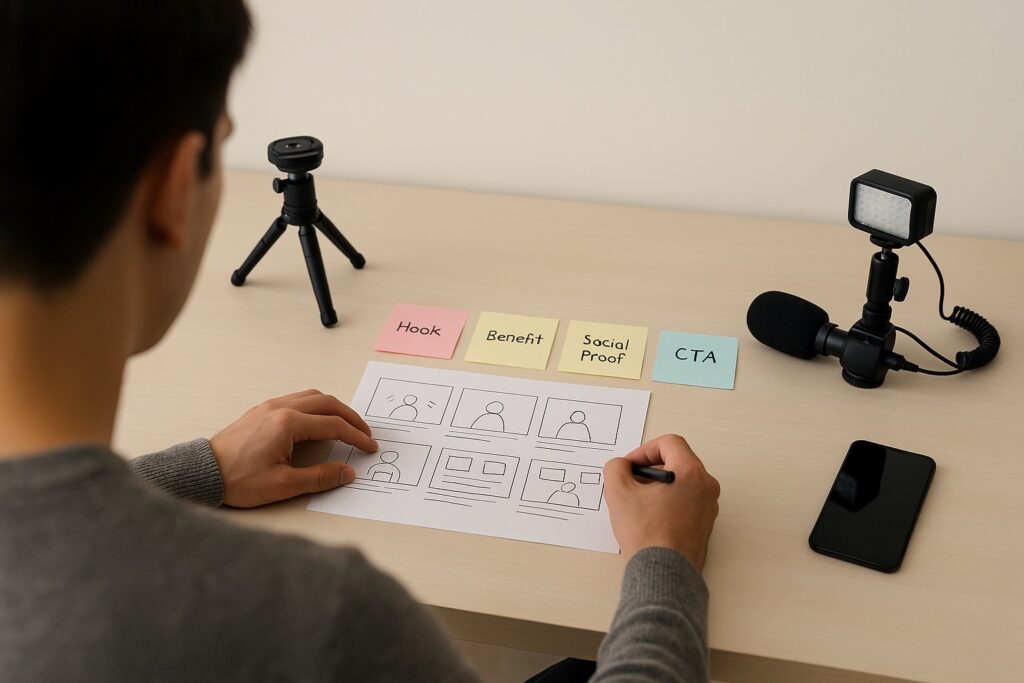 - Shoot. On-camera delivery, product B-roll, clean audio, good light.
